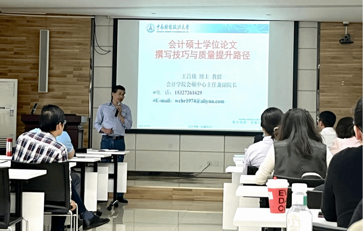 王昌锐教授以“会计硕士学位论文撰写技巧与质量提升途径”为主题,结合自己带研究生丰富的经验和感悟,重点讲解了学术论文指导过程中的要点和注意点,从理论和实践的层面进一步加深了学院师生对于会计硕士专业学位论文撰写、指导与评审的了解,具有很强的实践性。