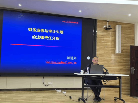 2025年12月1日,财政部原监督评价局局长、自然资源和生态环境司司长,中国注册会计师协会副会长、财政部财政科学研究院博士生导师郜进兴教授应邀到我校做学术报告,报告会主题为“财务造假与审计失败的法律责任分析”。