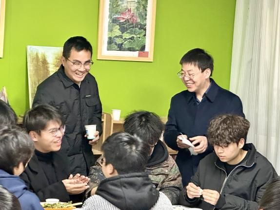 活动伊始,学生们分组协作,在南苑食堂工作人员的指导下学习揉面、擀皮、包馅。伍学云、赵磊与学生们一同动手,边包饺子边交流心得,还将象征吉祥的硬币包入饺子,制成“幸运饺子”。他们亲切询问学生们近期的学习和生活情况,叮嘱学生们期末注意劳逸结合。为增添活动的趣味本次活动设置了“饺王”评选环节,由食堂工作人员与社区辅导员从数量、质量、创意三方面评审,最终评选出3名“饺王”并颁发实践证书与礼品。随后的“幸运饺子”环节,吃到硬币的学生获得限量文创礼品,现场欢呼不断。