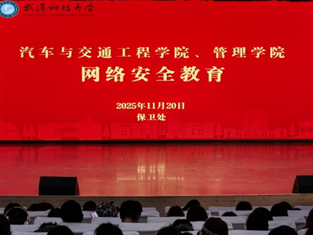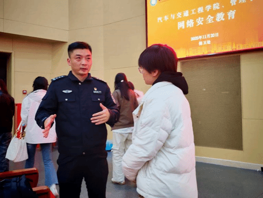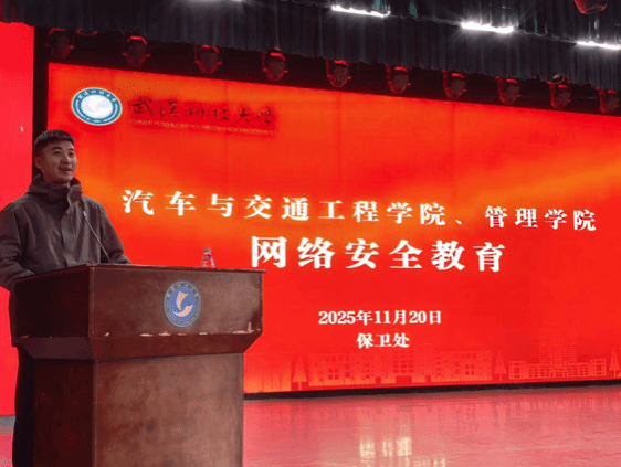 (通讯员:宋徐金鑫)11月20日,402am永利手机版与汽车与交通工程学院在沁湖礼堂联合举办2025级本科生网络安全教育宣讲大会,本次大会特邀保卫处治安科副科长刘承武担任主讲嘉宾,402am永利手机版2025级本科生辅导员葛红涛出席本次会议,402am永利手机版与汽车与交通工程学院全体2025级本科生共同参与。汽车与交通工程学院2025级本科生辅导员张宇欣主持会议。