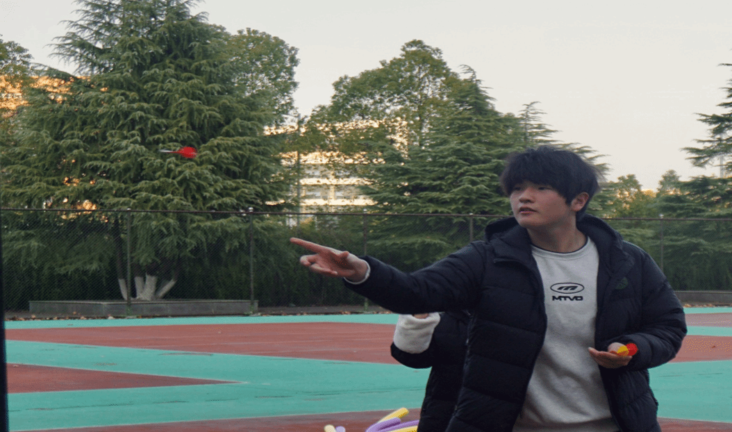 活动内容包括四个趣味游戏,分别是扔飞镖、投掷沙包、“接力不倒翁”和“暴击尖叫鸡”。“暴击尖叫鸡”游戏中,参与者在指定区域内使用海绵棒击打“尖叫鸡”,其趣味声响随击打同步释放,助力疏解压力与负面情绪。“接力不倒翁”游戏以小组为单位开展,每组成员手持棍子围成一圈,听裁判口令同步松开手中道具,迅速移动至相邻成员位置,在道具倾倒前接住并稳住,随后依次完成接力传递。扔飞镖区域内,学生们站在标线后,眯眼瞄准靶心,手臂稳稳发力投掷,投中高分区域时便会忍不住欢呼。